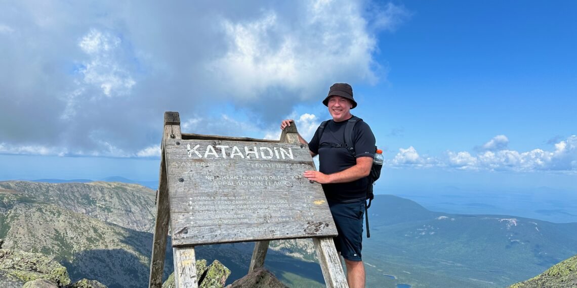 Don Trynor standing beside the Mount Katahdin summit sign with panoramic mountain views, fluffy clouds in the blue sky, and a green carpet of Maine forest in the background.